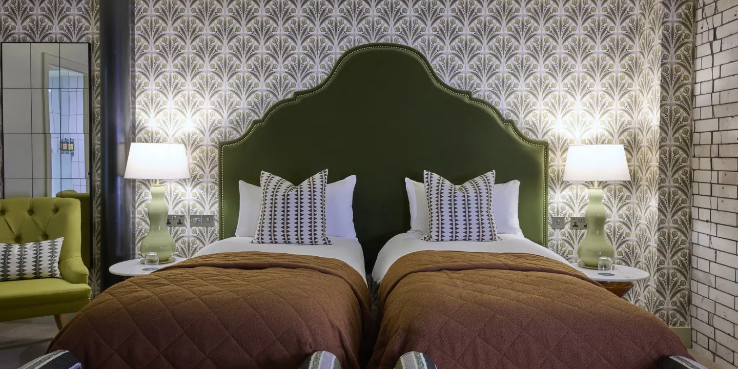 Our Deluxe Twin Rooms offer twin beds, a roll‑top bath in the bedroom or ensuite, and a separate walk‑in monsoon shower. Many overlook the peaceful courtyard.