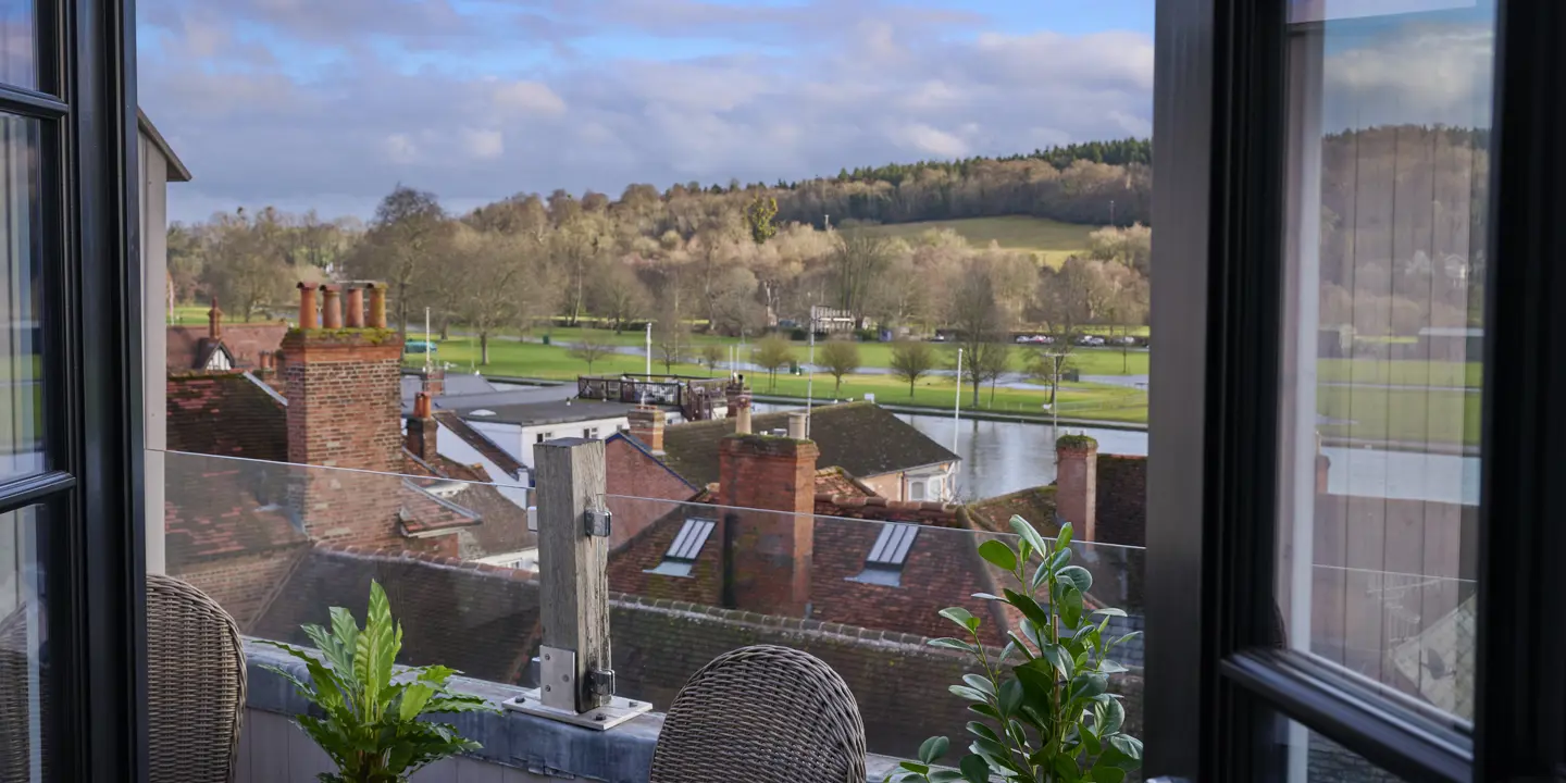 Our Riverview Suites offer a king‑size bed, seating area and an upstairs open‑plan bathroom, plus a private heated balcony with Thames views. French windows open onto the balcony, making it an ideal spot for relaxing or watching the Regatta.