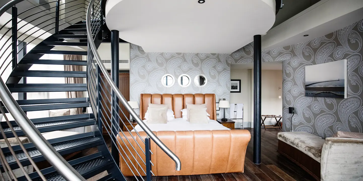 These spacious open plan suites are beautifully designed to incorporate original features, and enjoy a King size bed, lounge area and mezzanine level bathroom with twin roll top baths and walk in Monsoon shower.
