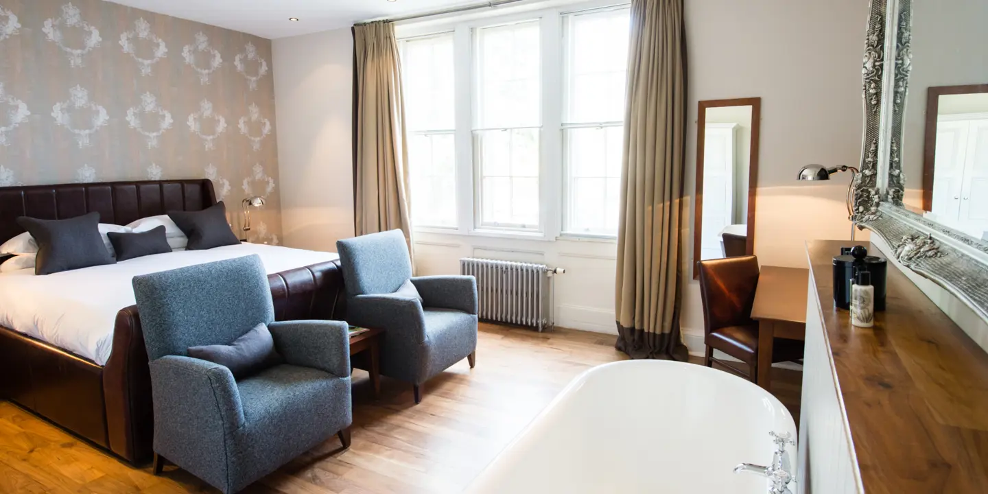 Our luxurious Junior Suites feature a super king size bed, a small lounge area for relaxation, a free standing roll-top bath in the bedroom, large plasma TV and a stunning, large walk-in monsoon power shower. Seductive in their quaint charm, the suites include luxurious toiletries to pamper with and a Nespresso coffee machine for that early morning wake up call.